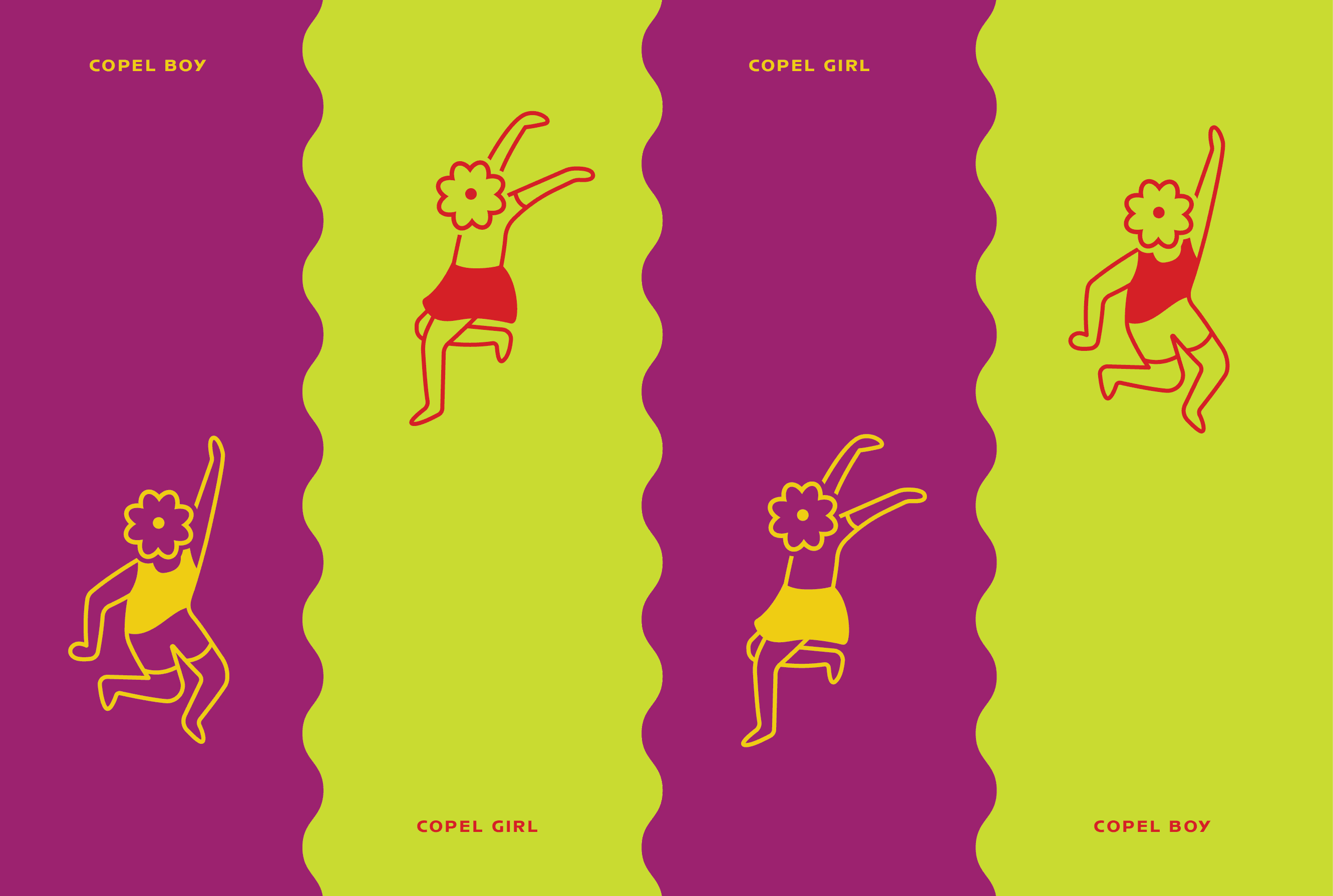 Inspired by Keith Haring's illustrations, the flower heads here symbolise the copels, floral crowns worn during this festival. The characters are illustrated in motion, jumping into a water body.